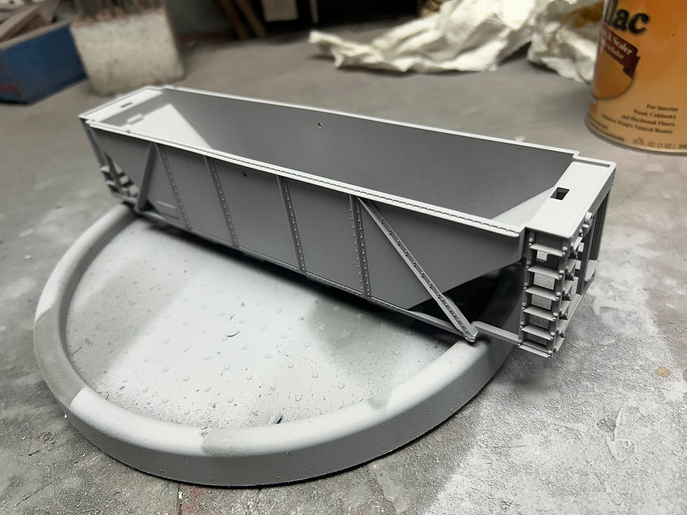 After painting, custom decals applied and a finishing coat of Dullcoat. Trucks cleaned up and wheels wire brushed. I made the hopper's load by carving a piece of Styrofoam to fit and glued fishtank charcoal to it.
